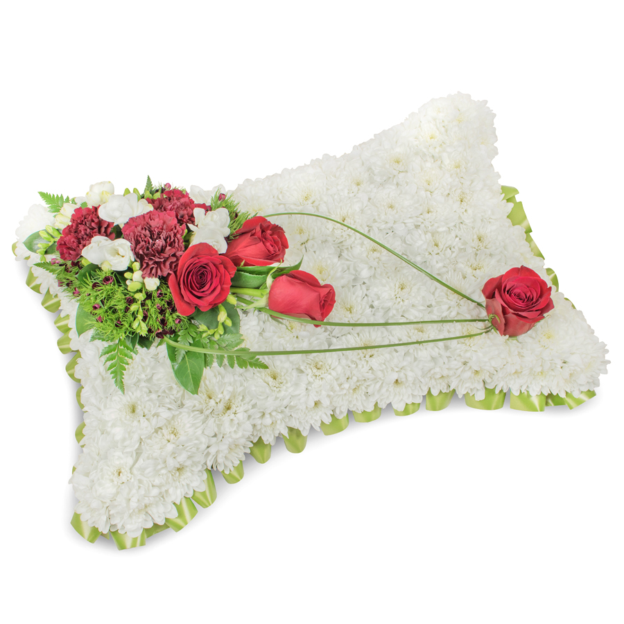 Express your heartfelt condolences with our stunning sympathy bouquet, meticulously crafted to convey your deepest sympathies. This unique arrangement features a harmonious blend of white chrysanthemums, red roses, white freesias, and dark red carnations, elegantly complemented by dianthus and bear grass.