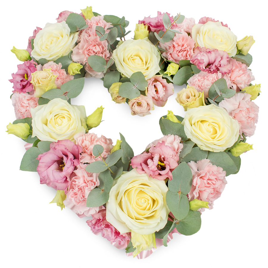 Show your appreciation and love with our Beautiful Heartfelt Tribute Bouquet. This stunning arrangement features a vibrant mix of white roses, pink carnations, pink lisianthus, and eucalyptus leaves, artfully arranged in an open heart shape to express your deepest emotions.